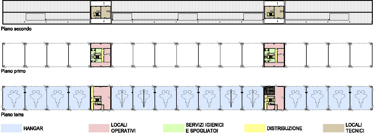 I manufatti sono stati costruiti con struttura prefabbricata poggiata su una fondazione diretta costituita da platea. Il progetto ha incluso specifiche tecniche di cui al D.M. 20/11/2017 recante “criteri ambientali minimi” per l’edilizia. Le opere edili e strutturali hanno riguardato la creazione di edifici per il ricovero degli aerei (Hangar) con sistema prefabbricato per disporre di ampie campate. Particolare attenzione è stata posta sugli impianti elettrici e speciali di sicurezza e sulle opere per il condizionamento del cockpit degli aeromobili.